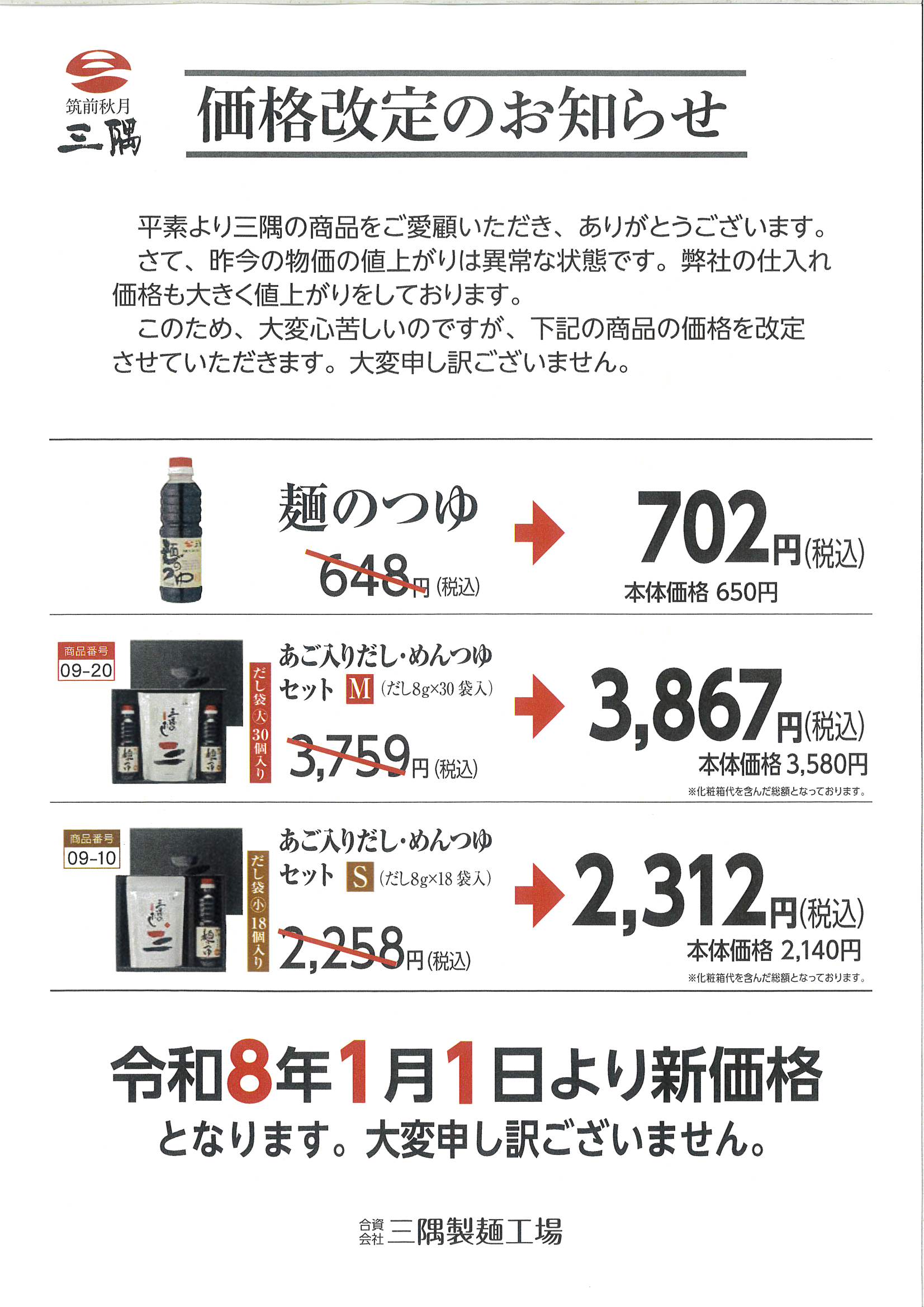 令和8年1月1日より、めんつゆの価格改定させていただきます。
